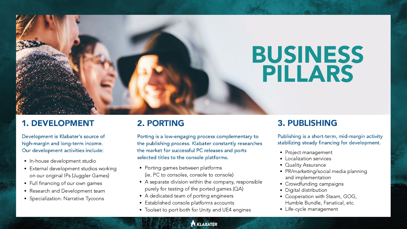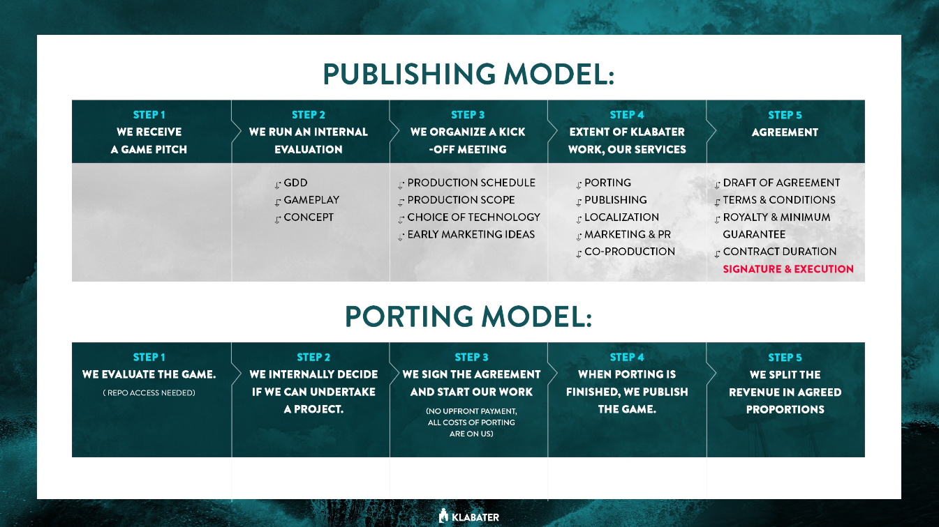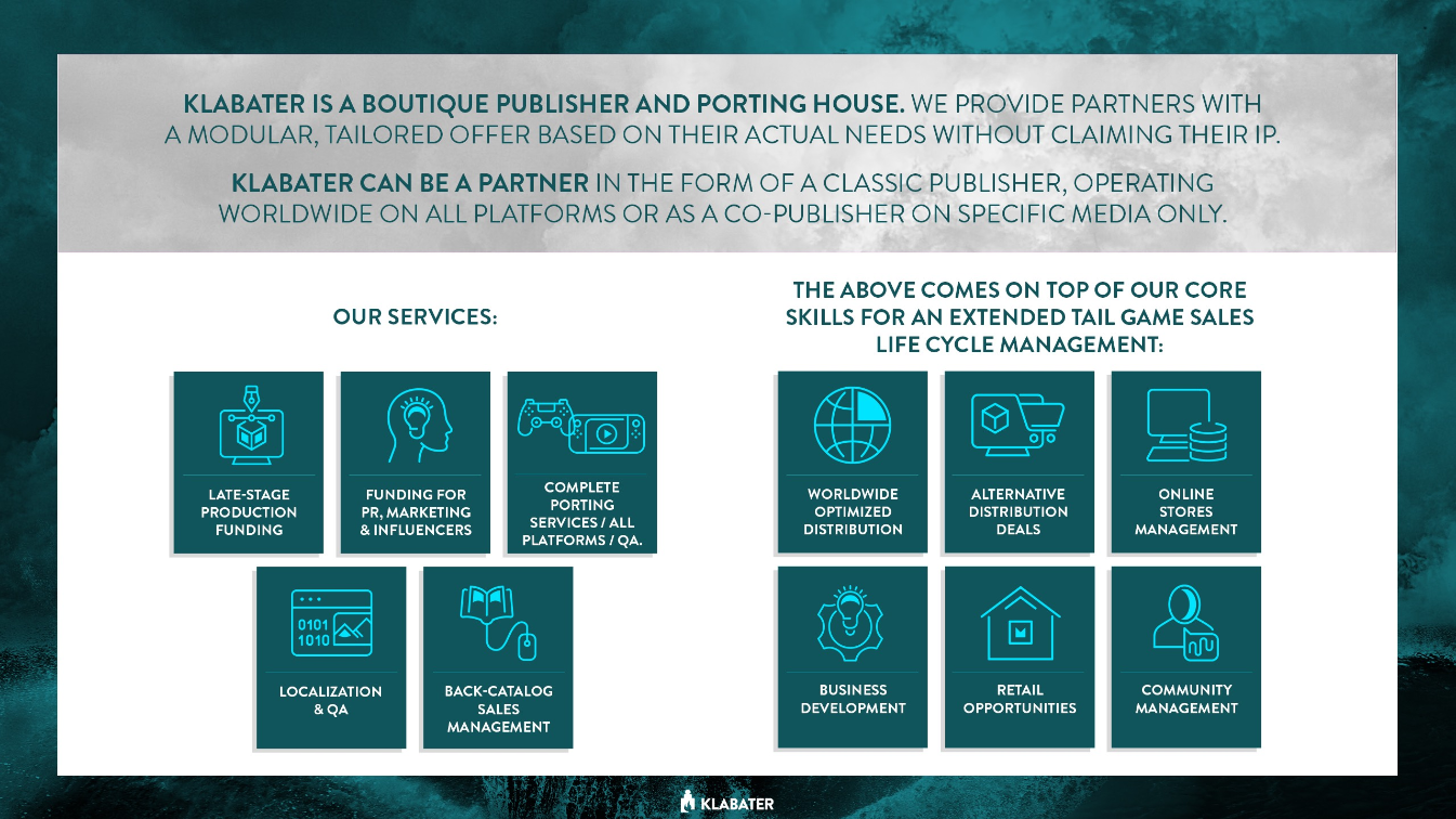 KLABATER is a global production and publishing house. The company offers complex services to the developers, our involvement includes anything from financial support and investment, through production process support, to a PR & marketing campaigns. We take the load off your shoulders, so you can focus on developing your vision into a successful game. In 2018, Klabater expanded its scope of activity by starting its own game development and porting services. The result of that is the birth of an in-house development studio and the expansion of the publishing division.